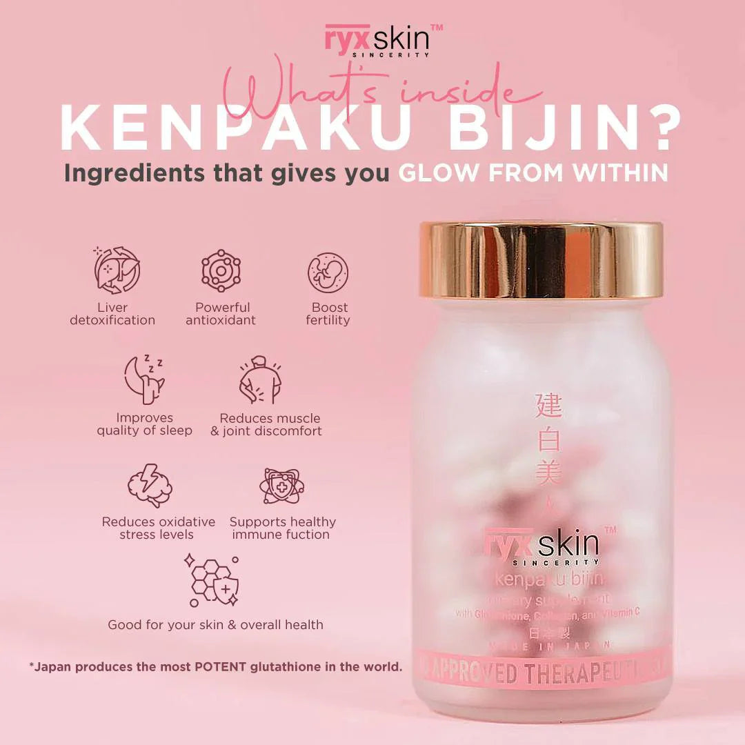 Experience Japanese spa quality with RYXSkin Kenpaku Bijin! Each bottle is packed with Glutathione, Collagen and Vitamin C, giving you the power to dramatically reduce wrinkles, brighten skin and protect against environmental damage. Pamper yourself with the skin care that’s fit for a queen!