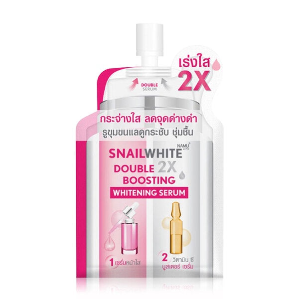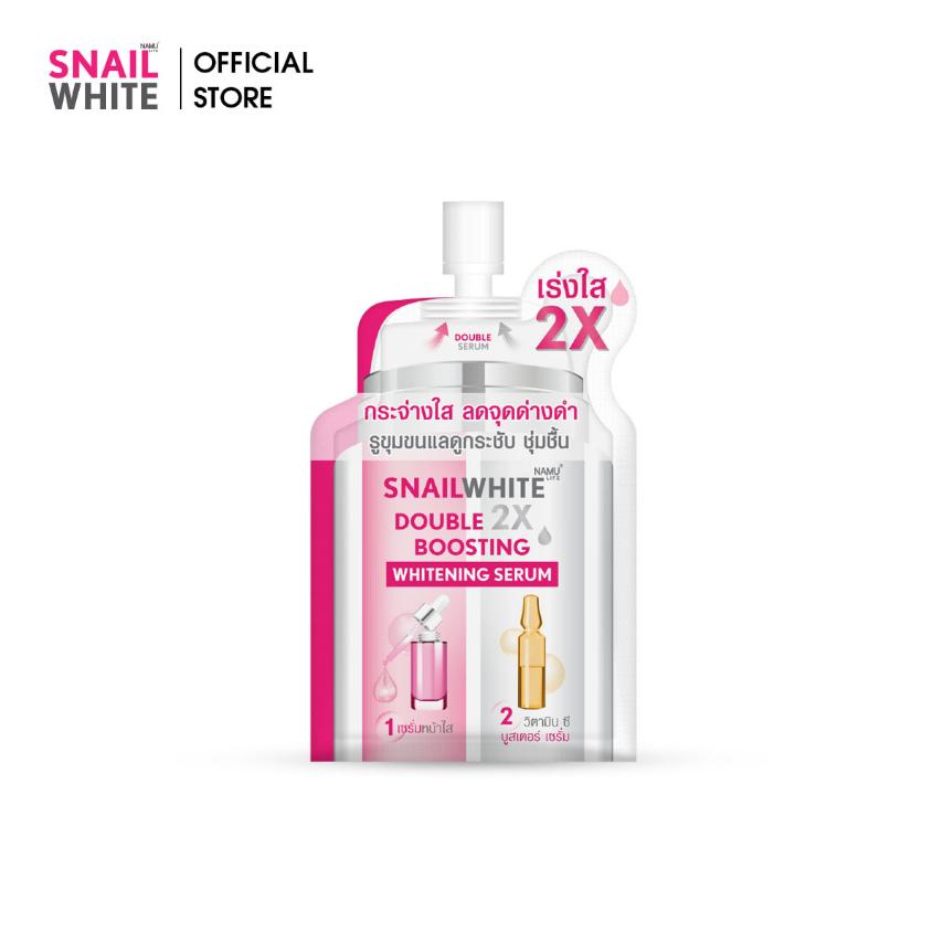 Enjoy two potent glow-boosting formulas in one with SNAILWHITE Double Boosting Brightening Serum. This two-compartment packet contains a serum and a booster enriched with powerful actives that work together to reveal spotless, glowing skin.