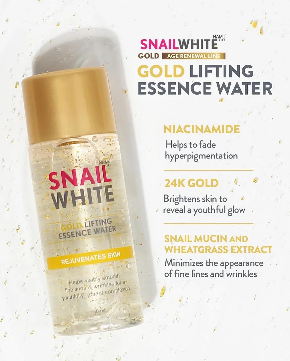 Get a youthfully lifted and radiant glow with this skincare-boosting essence water from SNAILWHITE. Infused with powerhouse anti-aging actives 24k Lipobelle Gold, Wheatgrass extract, and Snail Mucin help to lift the skin and smooth the look of fine lines & wrinkles. Niacinamide helps even out the skin tone and fades the appearance of dark spots. This lightweight essence water infuses skin with rejuvenating moisture and helps better absorb the next steps of your skincare for a healthy and radiant complexion.