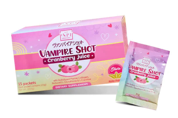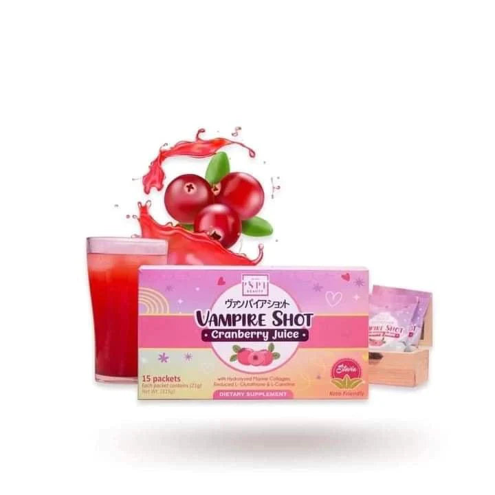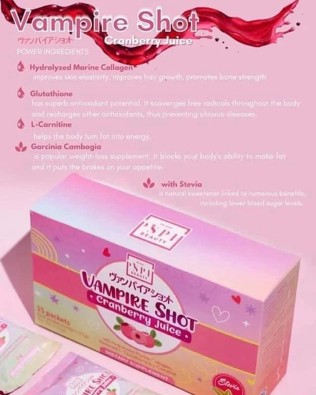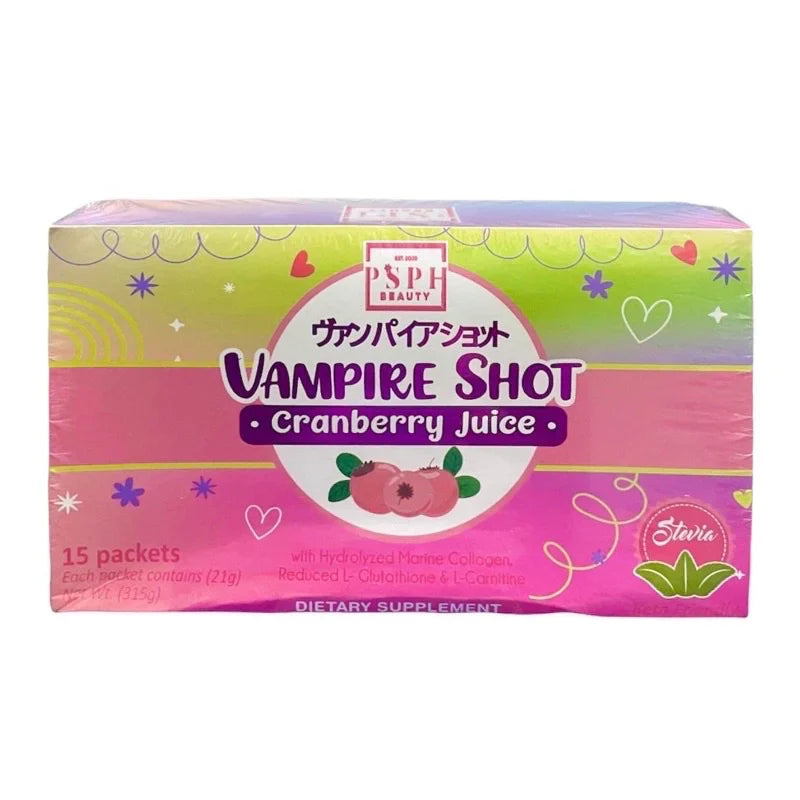 Experience something new with Vampire Shot Cranberry Juice - a refreshing blend of cranberry juice and hydrolyzed marine collagen. Enjoy a boost of collagen while your taste buds indulge in the sweet yet tangy flavor of cranberry. Refreshing and nutritious - try it today!